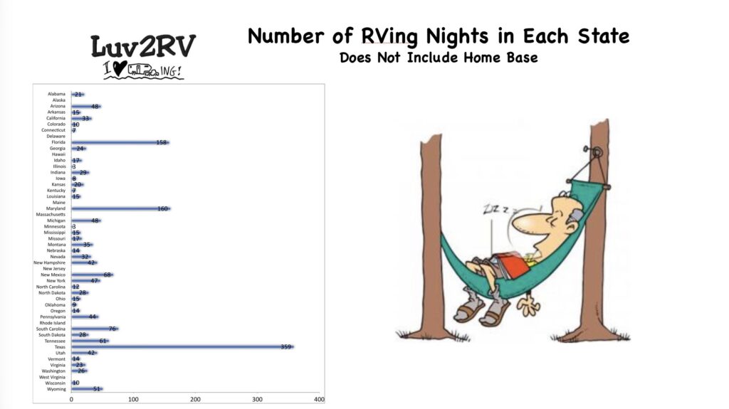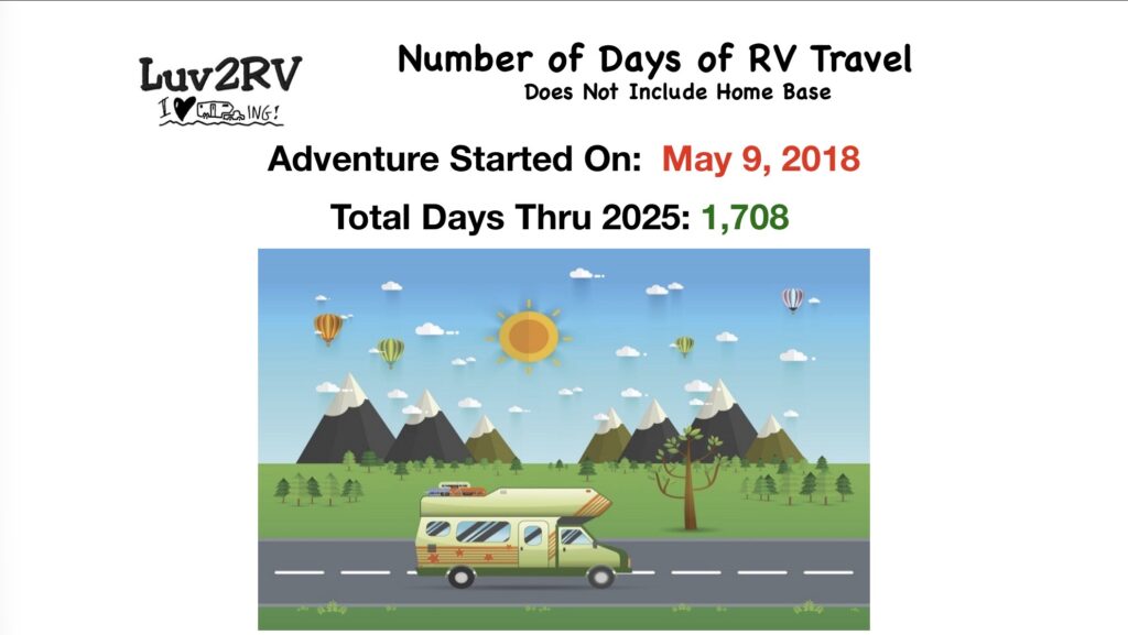 Here are some miscellaneous facts related to my full-time RV lifestyle. Things like how many days have I been on the road, what states have I stayed in, what is the most and least expensive camping night, and other tidbits of trivia. Hope you enjoy it!