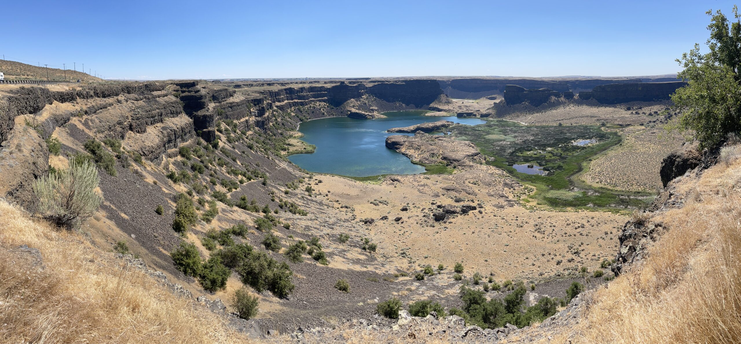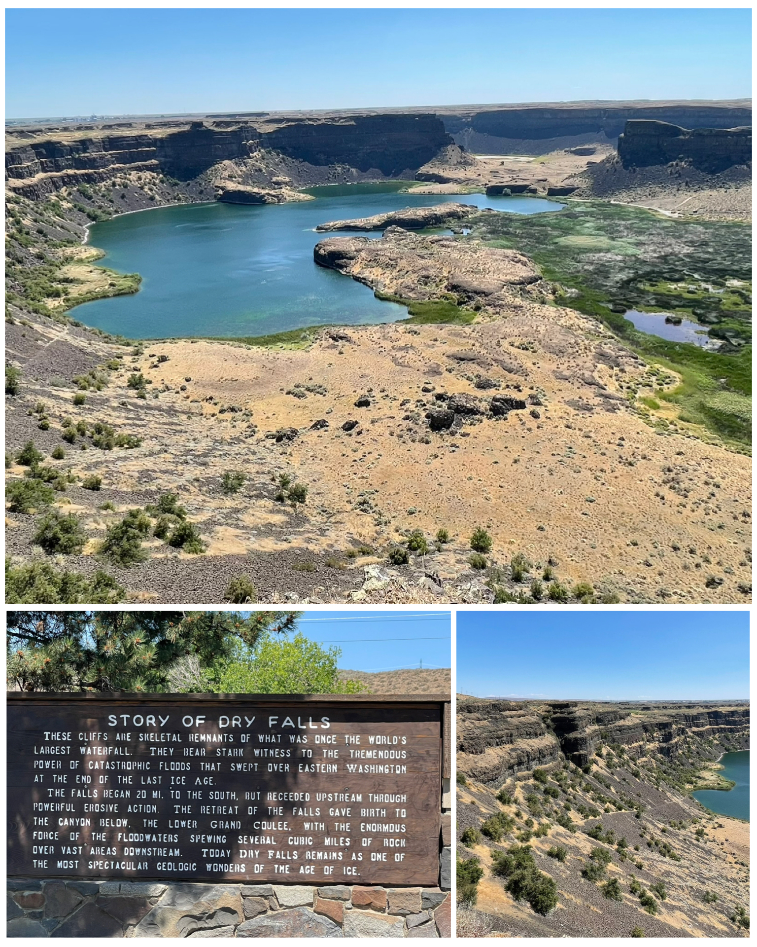 I travelled some 60 miles to the north to Coulee City to visit Dry Falls. The story of Dry Falls goes something like this. Some 20,000 years ago during the glacial period, large ice sheets blocked the natural flow of waters along the Columbia River, and a series of events caused major flooding and the redirection of water. That flood water traveled here, plummeting down over 400 feet creating this coulee. It is estimated that the resulting falls were five times the width of Niagara Falls, with ten times the flow of all the current rivers in the world combined – making it what would have been the largest falls in the world. Today, it’s a big hole in the ground with some water, surrounded by hundreds of feet of sheer cliffs. Certainly is pretty though!