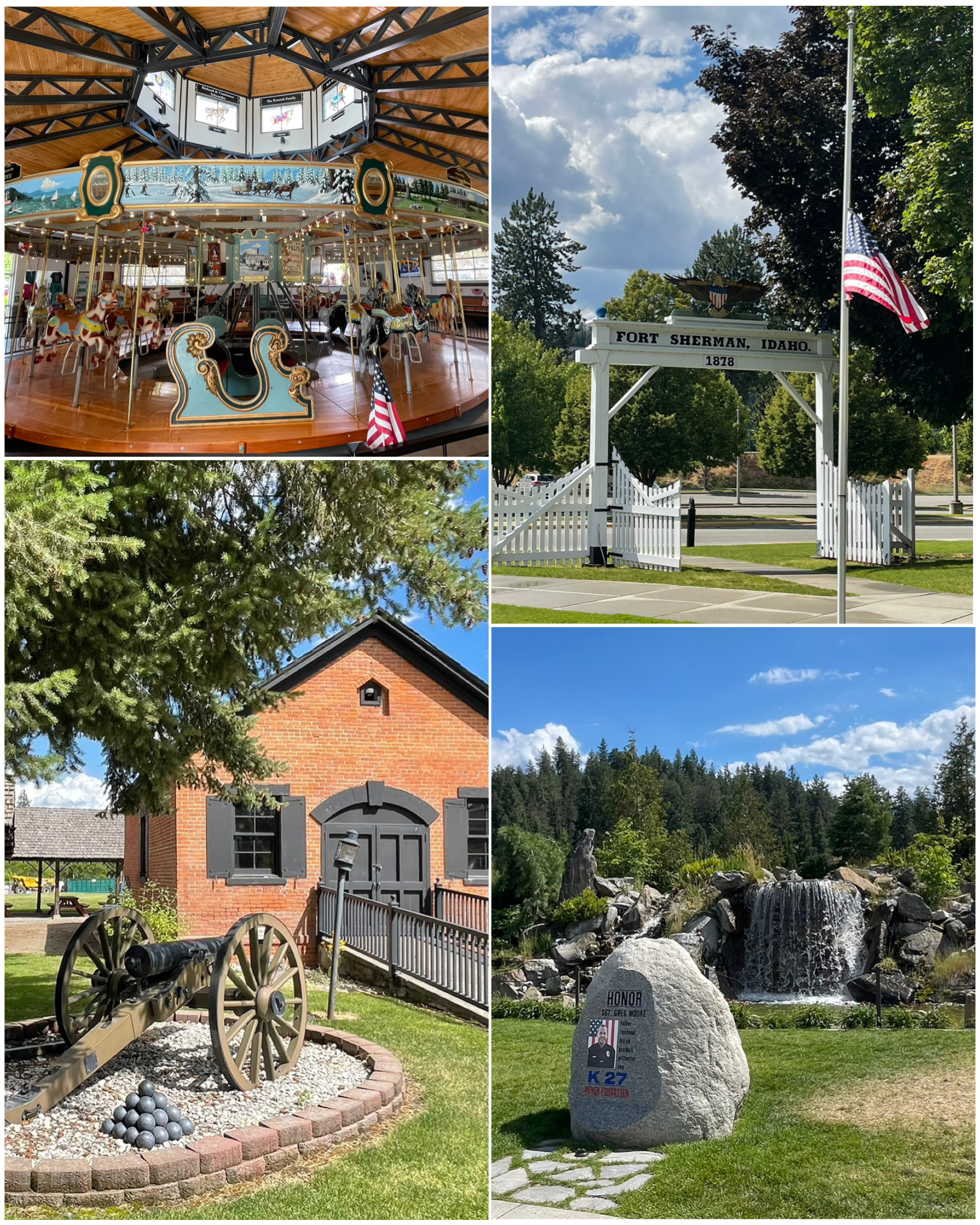 We also visited a really cool carrousel where we took a Segway break, and went inside to cool down a bit and to get a closer look. While we were standing around admiring the ride, the carrousel operator came over to us and asked if we wanted a free ride. She needed to use us so that she could adequately balance the weight of the ride – evenly spreading out Lucy and I along with the small number of paying customers. So, that we did! It was a fun ride, and I was handed a number of plastic rings as I went around that I needed to toss into a bucket that was on the other side. While I didn’t keep an actual count, from the 20 or so that I tossed, I’m pretty sure I only missed one. Not bad! Last we visited a really nice memorial that features three waterfalls representing “Respect”, “Honor”, and “Remember” that was created to honor Sgt Greg Moore who, back in 2015, became the first CDA officer killed while in the line of duty. His call sign was K27, which is featured in this memorial as well as all over town to serve as a reminder to the sacrifice he made. It was a beautiful and very reflective memorial.