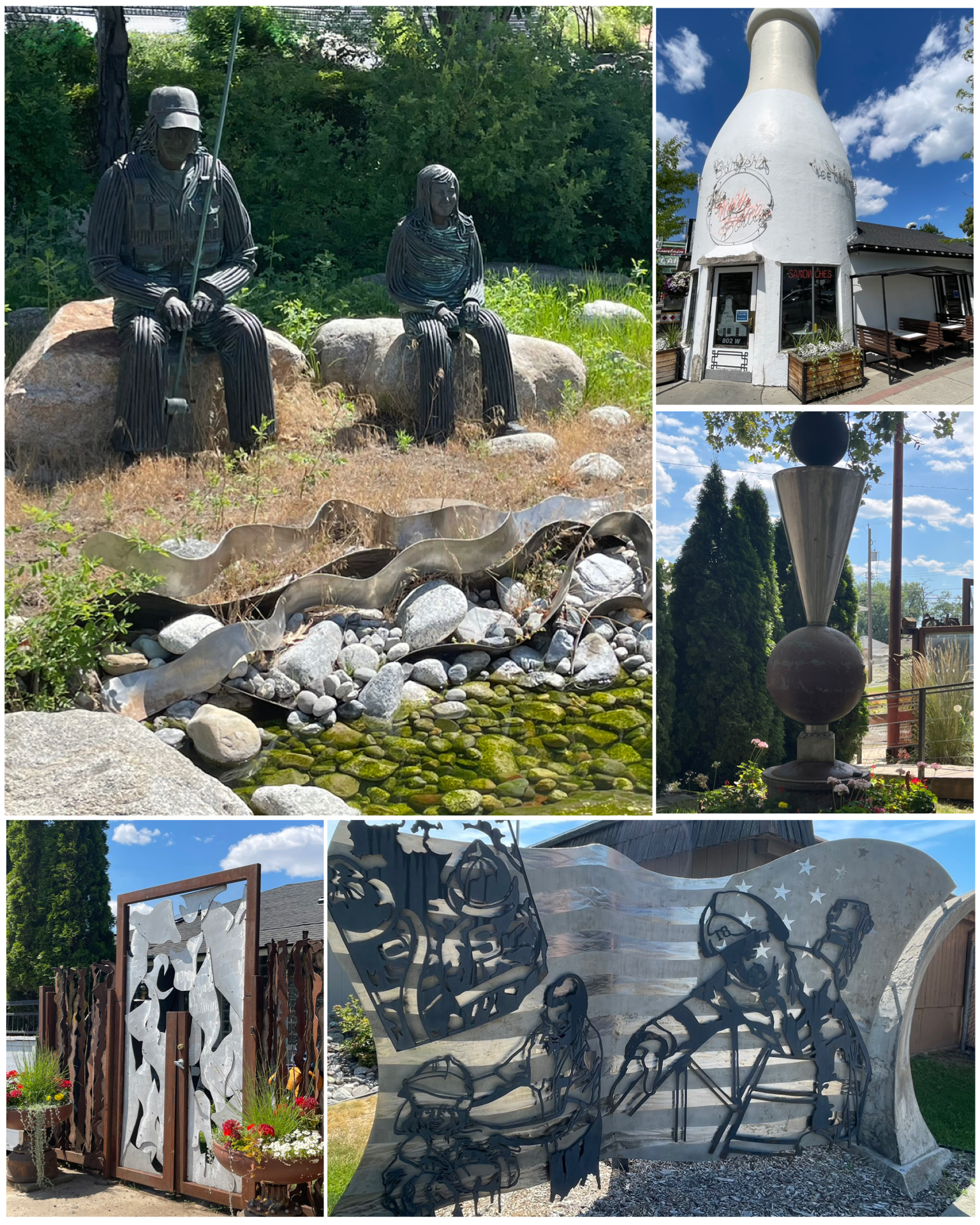 Now back to some playing tourist. The next day I ventured off to the west a bit to do some sightseeing in Spokane, WA. There were a number of interesting Roadside treasures to check out. First up, was this milk bottle building. What was once part of the Benewah Dairy Company, this is one of two surviving Spokane milk bottle buildings. Today its simply called The Milk Bottle, and is a cafe/restaurant. Next, I drove out to the Spokane Riverside Park Wastewater Treatment Plant to see this cool and touching memorial (at right, top left). It features the likeness of Mike Cmos Jr. doing what he loved most – fishing. Tragically in 2004, maintenance man Cmos was looking into an issue with a digester tank that was malfunctioning. He climbed atop the 40-foot tall tank when its roof collapsed, dropping him into the tank with millions of gallons of sludge. Sadly, he was found two days later resting near the bottom. The collapse also let loose some 200,000 gallons of sewage in the local area including into the nearby Spokane River. It was quite a mess and such a tragic story and such an awful way to die. May he rest in eternal peace! Next I visited a Spokane fire department to see this 9/11 memorial (at right, bottom right). It was a nice piece with sillouettes of firefighters in front of a steel flag. Nicely done! Last up was a visit to a private residence that featured a number of metal art pieces throughout their yard. This included a number of pieces made from scrap steel and truck car parts formed into various pieces of art. Some were even functional including some planters for some flowers and also a fountain. There was also a really cool steel door at the side entrance to the property. Pretty talented fabricator!