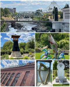 Next, I stopped in downtown Spokane to walk around Riverfront Park. There was lots to see here, and many entries on Roadside America. As I first walked into the area, I was greated by Spokane Falls that is fed from the Spokane River (at left, top). It was very beautiful to watch. Next, I ventured into a sculpture park where a number of various art pieces, made by various artists, are featured. There is also a large brick building belonging to Washington Water Power – no doubt extracting hydro power from the Spokane River.