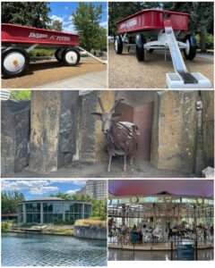 From the Roadside list comes these featured finds here in the park. This massively large Radio Flyer red wagon has a staircase on one side to get into the wagon, while the handle on the other side doubles as a slide for an easy exit. Then there is this garbage goat – not only an art piece but an actual functional keep the area clean contributor. Kids all over were having a great time “feeding” the goat a variety of trash including plastic bottles, paper, and even leaves from the area. This goat has a vacuum for a mouth and eagerly consumes most anything you want to feed it. What a great way to keep the park clean! Next up was this 100+ year old 1909 Looff carrousel inside a beautifully built round house. There was a time when the carrousel was located in a park that had closed, was no longer being maintained, and was at big risk of being sold off and taken to another community. But it would be Bill Fearn who was the Director of Park & Recs from 1965-79 who would fight to save the carrousel that had been a local landmark for children since it was originally built and delivered to Spokane in 1909. He started the campaign to save the merry-go-round and raised enough money to not only restore and relocate the carrousel, but to also build this magnificent building in which it now resides. He obviously had the vision and means to pull off this amazing save.