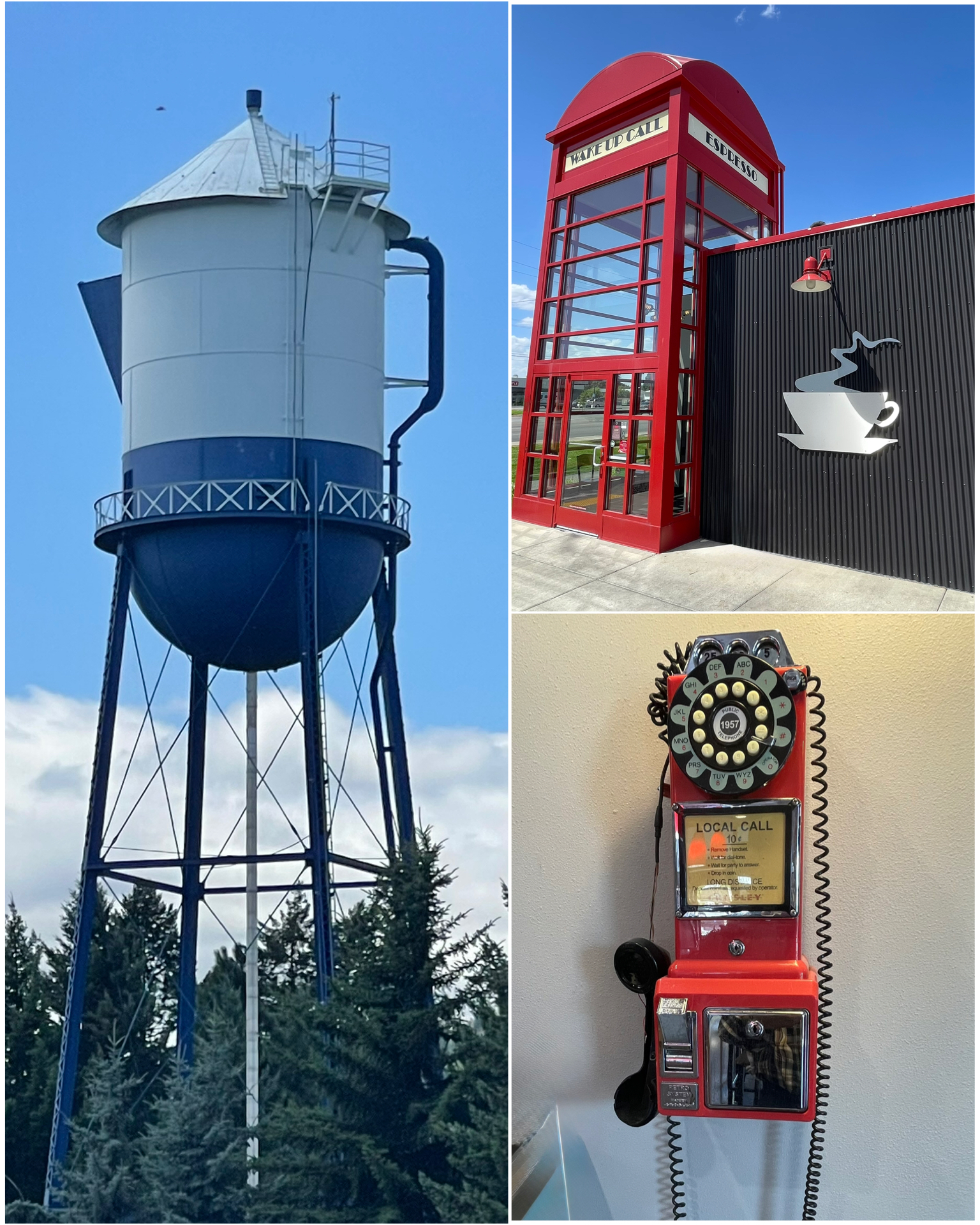 On my way back to Idaho from Spokane, I stopped in to a place called Wake Up Call. Besides being a coffee and snack shop, it is also featured in Roadside for having a building design that incorporates a giant British style phone booth. Since it was mid afternoon when I arrived, I took the opportunity to not only snap a few pictures, but I also availed myself to a cup of mocha latte and a big slice of banana bread. Yummy! To complete the whole telephone theme design, there was even a working, somewhat vintage pay telephone inside. Next, I travelled almost an hour back towards the east, and about 25 miles to the north to checkout this water tower turned teapot. I know, it was a long way to go to to see a silly teapot, but this was one of the Roadside entries that did not have any pictures. For those, I tend to make an extra effort to go and see so that I can take and submit some pics so that I contribute back. Anyway, it was a cool looking tower, and now Roadside will have a picture of it.