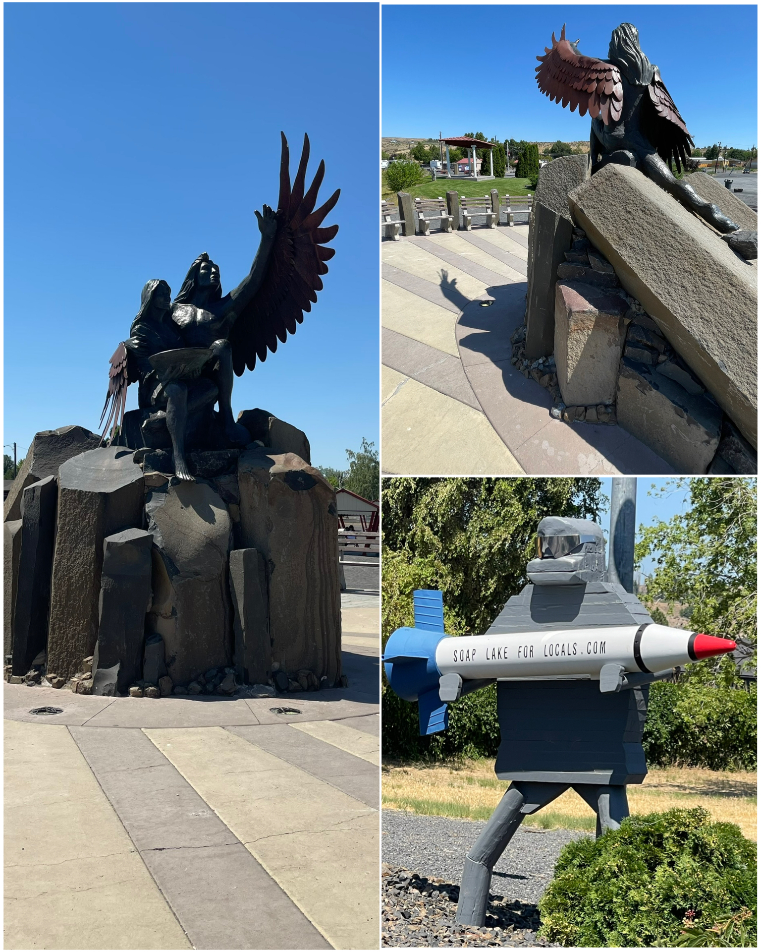 Next, I worked my way back to the south, stopping in the town of Soap Lake. Here there were a few interesting Roadside attractions. First among them was this giant lifesize human-like sundial. Titled “Calling the Healing Waters”, it was unveiled in June 2009 and was sculpted by artist David Govedare. It proclaims to be the world’s first human figure sundial, and the largest human figure sundial in existence. The giant wing protruding from the avian humanoid’s back serves as the pointer casting the shadow from which the time is derived. I found the time was off by about an hour – suggesting this sundial has not been adjusted for daylight savings time. Really a beautifully done sculpture. Next, in a