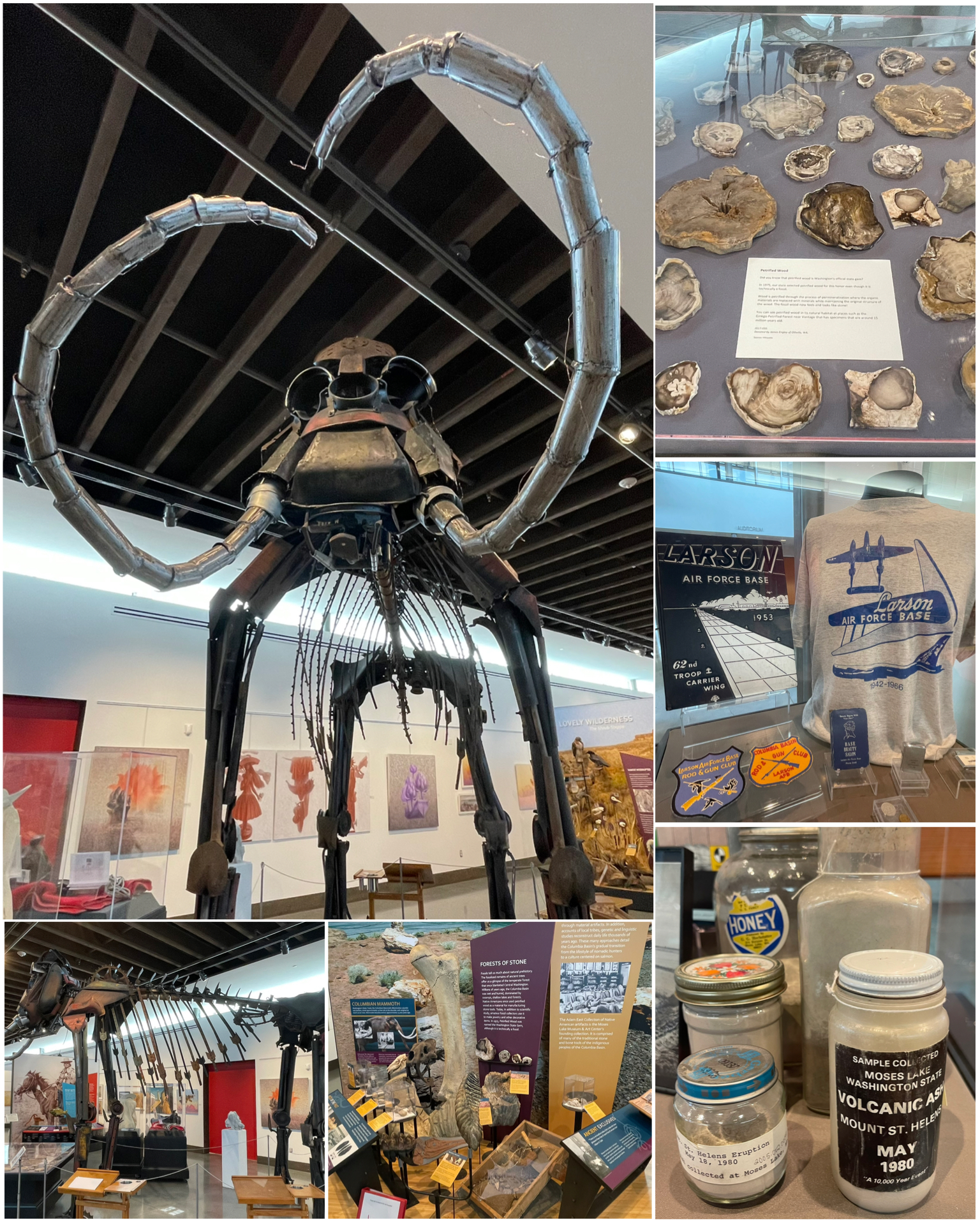 Last up on my trek back south towards home was a stop in Moses Lake. This is a fairly large city, with a population exceeding 22,000. There’s lots of history in this town, so I figured a trip to their little regional museum would be a great place to learn about some of it. A few things that I did learn was that petrified wood was Washington’s official state gem, and is apparently fairly plentiful in areas such as the Ginkgo Petrified Forest about an hour west of here. The other thing I found interesting in the museum were these jars of volcanic ash from the 1980 Mount St. Hellens eruption. Apparently, souvenirs of the ash became a collectible thing and a source of revenue for the towns that were covered in it. Too funny! I also learned that there was once an Air Force Base here in Moses Lake. It was activated in 1942 as a temporary World War II training center for P-38 Lightning fighter pilots, then later bomber training in the B-17 Flying Fortress. Today, it is the Grant County International Airport. Also with its massive runways, it served for decades as a commercial training center for large Boeing aircraft pilots.