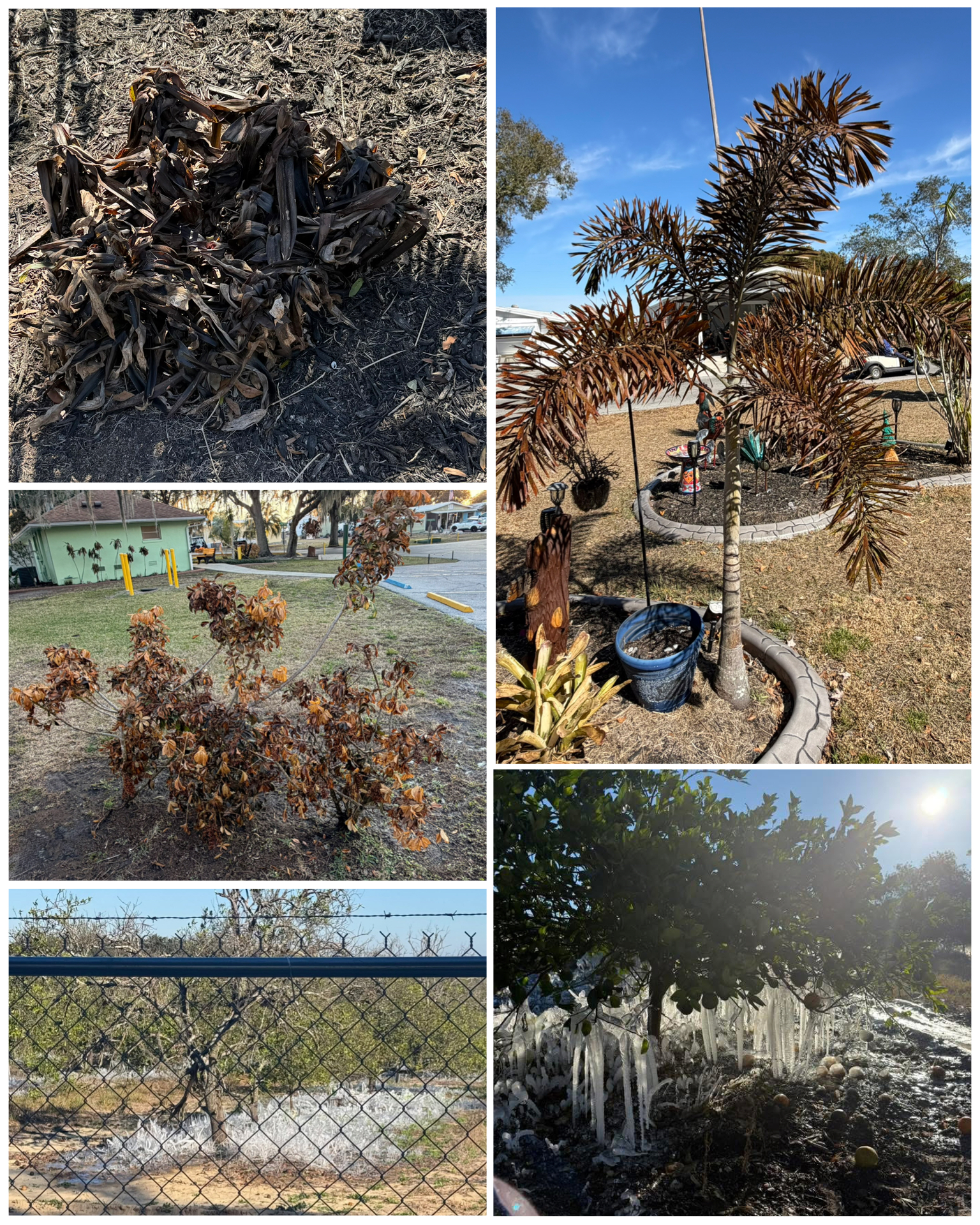 Interestingly enough, the orange groves around our community actually flood their trees with water which in turn will freeze (see pics at left, bottom) into ice.  That somehow serves to protect the trees and associated fruit that has yet to have been picked.  I frankly don’t understand the science behind that practice, but apparently it’s what they do down here. As for my own crops, many did not fair that well.  Some of the loss I could care less about as I never really liked those plants anyway.  But, I’m sickened to see my foxtail palm tree (at left, top right) that I planted myself several years ago, looking all brown and damaged from the hard freeze.  I’ve been told and have read that I just need to pretty much leave it as is, and water it to provide strength to the roots.  The tree might come back and survive, or perhaps it may not.  Apparently I’ll know more in the next few weeks.  Fingers crossed that it makes it!  I just read that overall, Florida did not fair well during this freeze.  Just over $3.1B of loss to state agricultural production has been reported.  Interestingly, it was sugarcane that sustained the greatest loss at just over $1.1B, with citris crops coming in second at $674M.  Strawberry growers suffered over $300M in loss, while blueberry farmers lost 90% of their 6,400 acres.  Lastly, corn was a total loss as it was reported that 100% of all crops were lost to the freeze representing a $255M financial impact.  So, overall a pretty significant hit to Florida farmers.  Hopefully there are state and/or federal programs in place to help them with their losses.