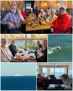 This time of year, specifically the Super Bowl, often provides an opportunity to get together with family.  This year once again provided such an opportunity.  My brother Dick and SIL Kathi even flew down from New Hampshire for a week or so winter getaway.  So they, and brothers David and Gerry, SIL Debbie, and cousins Louise and Denise all got together for a terrific lunch (at left, top).  It was terrific having this large of a family gathering.  Dick and Kathi were staying at brother Gerry’s place at Satellite Beach, and I drove up there as well to stay a few days with them.  We had a great time catching up on Olympics hapennings and enjoying the amazing views outside his 9th story ocean-front condo – watching surfers taking on the waves, as well as cruise ships heading out of Port Canaveral to their ocean voyages.  The following day we headed to a local Thai restaurant where they all had Thai cuisine, while I enjoyed something more my style from the Japanese menu. Yum – sushi!  Sunday Dick and Kathi left to head back up to the cold north, while Gerry and I watched the Super Bowl.  For me it was a disappointing outcome seeing the Patriots getting walloped by the Seahawks, but for brother Gerry who was born in New England, but spent most of his adult life in the Seattle area, he came out a winner regardless of who won.  Oh well – congrats to the Seahawks.