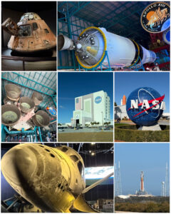 The following day, Gerry and I headed out early and drove to Kennedy Space Center.  This was my first ever visit here but I was fortunate to have a tour guide brother who is an annual pass holder and has been several times.  He expertly navigated us through all the things we should see and do, while doing so in the most logical order to ensure the best trip outcome.   It really was an amazing place with some really amazing things to see and experience.  We first took a bus tour of the facility which took us by the VAB (vehicle assembly building) (at right, center) where rocket components are built then stacked on top of each other atop a massive launcher platform that will eventually take its 2 mph trip out to a launch site.  We also stopped at the Gantry at LC-39 – a multi story structure that offered amazing 360 degree views all across the complex and its launchpads.  From there, we got a front row seat view of Artimas II sitting out on its launchpad (at right, bottom right).  I’m keeping tabs on that specific launch schedule and may try to visit my brother Gerry again to get to see it launch.  Back at the KSC main area were several buildings containing all sorts of NASA history and artifacts including a Saturn V rocket, Gemini 9 and Apollo 14 capsules, recreated launch control rooms featuring actual and original consoles, and even the massive Space Shuttle Atlantis (at right, bottom left).  We even experienced a shuttle launch in their simulator ride.  Tool cool!  It was an amazing day exploring all there is at this terrific facility.  I’ve got tons more pictures from this trip, so be sure to click the link at the bottom of the blog to see all the rest.  Thanks Gerry for hosting the gathering and for being the great NASA tour guide.