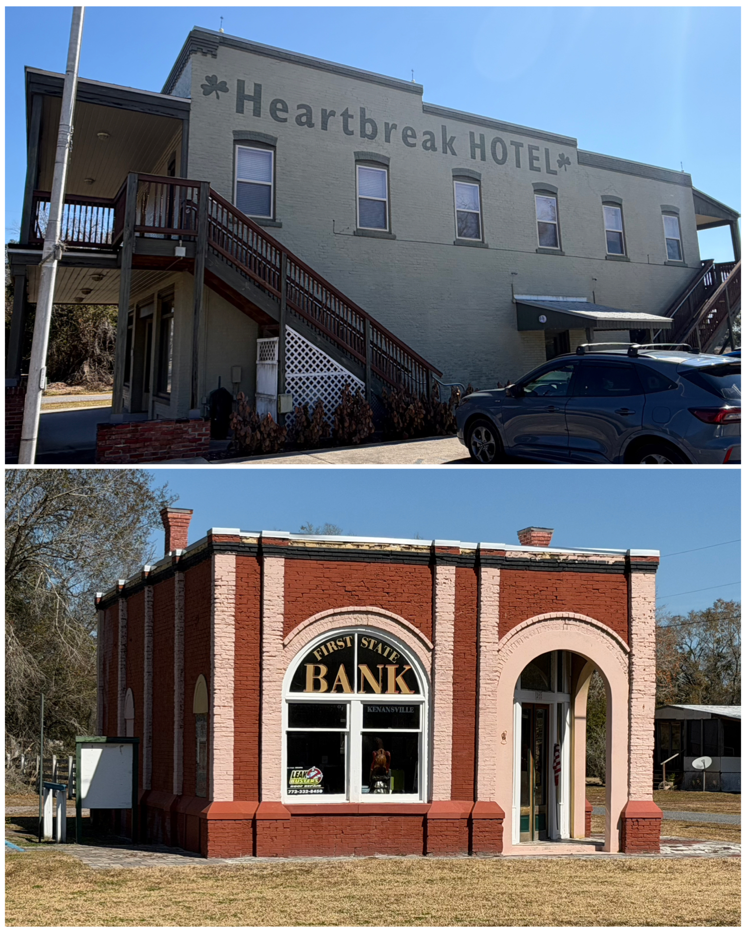 On the way back from staying at my brothers house, I took the back roads to avoid I-95 and the excessivly long 60+ mile hike along Rt 60, in favor of some much less traveled roads that took me through some much less travelled towns.  One such town is Kenansville – named after the third wife of Henry Flagler, a key figure in the development of the Atlantic coast of Florida and founder of the Florida East Coast Railway, Mary Lily Kenan.  Considered today to be a ghost town, this once thriving community of the late 1800s to early 1900s was a stop along the railway, and served as Florida’s east coast cattle center with herds of cattle being driven through city streets by cattle ranch cowboys.  Cattle ranching declined, and when the railway stop was removed in the 1920s, that was the beginning of the end of this once bustling town.  Today, the population stands as just over 450 – several of whom still do cattle farming.  Besides the history of the town, two historical buildings stand across from each other featuring their own piece of history.  The First State Bank building was at the heart of Kenansville’s financial world during the cattle boom.  Many loans and other ranch transactions were done here, while also holding the financial wealth and fortunes of those cattle barons.  Thinking it was just an abandoned relic of the past, I only took pictures of the bank from the outside, but have since learned that the inside holds a series of wall paintings that depicts the history of the town.  I’ll have to check those out on a future drive by.  Across the street from the bank is the Heartbreak Hotel.  The hotel opened in 1915 and at the time was named the Piney Woods Inn.  In the 1940s and 50s when the town was in decline and the hotel in major disrepair, locals started calling it the Heartbreak.  Well, that eventually stuck, and when it was purchased and restored in the mid 50s, it bore the name Heartbreak Hotel. Legend and folklore has it that during one of Elvis Presley’s tours through Florida took him through Kenansville where he stayed at this hotel, and that was the source of his inspiration for his 1956 mega-hit of the same name.  This was never verified by Elvis himself, and in fact is disputed by many.  So, who knows for sure, but it does make for an interesting story and serves as an attraction to spend the night in this quaint little hotel in this quaint little town.
