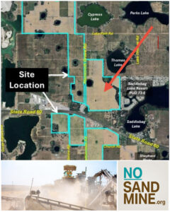 • The 200 acre section (shown at right with red arrow) that is directly adjacent to the Saddlebag community, and was one of five sections part of the original proposed mining operation, will be excluded from the resubmitted proposal and not be part of this mining operation request before the county board