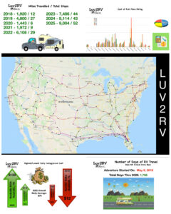 I finally found the time to update all my Fun Facts to include all the data from 2025.  You can see the full size elements on the Fun Facts page HERE, or at the top of this page along the navigation bar.  There were a few items of interest with the 2025 data. First, there were two new all time highest nightly campground charges realized last summer.  The highest at $133 per night while staying at the Nashville KOA in Tennessee (ouch!).   I guess being a high tourist area, they can charge these ridiculous prices.  Fortunately, I was only there for three nights, so the damage was somewhat limited.  The next 2nd highest priced stay was also at another KOA (why do I like KOAs?) and was for my one week stop in Pentaluma, CA.  This was actually an unplanned stay as I was supposed to be staying closer to the Napa area.  But at the time, there was a localized wildfire in the area, and the campground that I had booked prior was closed to travelers so my reservation was cancelled.  I had to quickly find a last minute alternative, and this was one of my only options.  Gotta love those California prices!  The other interesting data result was related to my overall budget and spending.  Most categories continue to track on a somewhat consistent and predictable level.  However, like past years, there are always a few outliers where the spending varies wildly.  Though my overall unplanned maintenance costs were mostly limited this year (a $500 broken window replacement, and a $500 RV landing gear leg replacement), I did incur many thousands of dollars in what I would call elective maintenance.  These included the replacement of both my RV air conditioning units, replacement of all slideout seals, and a roof sealing treatment.  So in the end, my overall spend of just under $13K in maintenance once again busted this budget category.  Campground fees also continued to be high – coming in at just about $13K for the summer, with an overall average daily rate of $79 – up significantly from $65 the year prior.  Last up was my spend in the category of Tech/Toys.  This category is purely discretionary, and is exactly as the name implies – purchases of technology or otherwise toys to mostly amuse myself.  While my prior 6-year average in this category was just under $2,500, it would appear that I totally overspent in that category last year.  But in my defense, there were several high-ticket items that needed to be purchased.  This included buying the robot lawn mower, which in the end, should save me money by avoiding future lawn service fees.  I also purchased a new iPhone last year, having upgraded from an iPhone 8 to an iPhone 13 – so it wasn’t like i spend foolishly on regular upgrades!  I also upgraded my old aging Mac laptop with a new model – albiet I bought it used so as to not spend too much money.  I also purchased the Starlink satellite Internet device to have as a last resort backup for Internet access.  Darn good thing too that I purchased this as I actually used it while I was in the boonies of western California where I had zero cell service on any of my three carriers (AT&T, Verizon, TMobile).  Lastly, my security system back home took another lightning strike over the summer, and since I had to replace some of the damaged equipment, I decided to do a bit of upgrading there too.  So overall, I spent just under $9K in this totally discretionary category, and frankly I figure I’m worth it!  Overall, my prior 6-year total spend averaged close to $60K, and this year my overall spend was just over $70k, but just over $1k more than the prior year.  Overall, I’m satisfied with that.  Besides, as my brother Gerry always reminds me, I’m just spending my kids inheritance anyway!