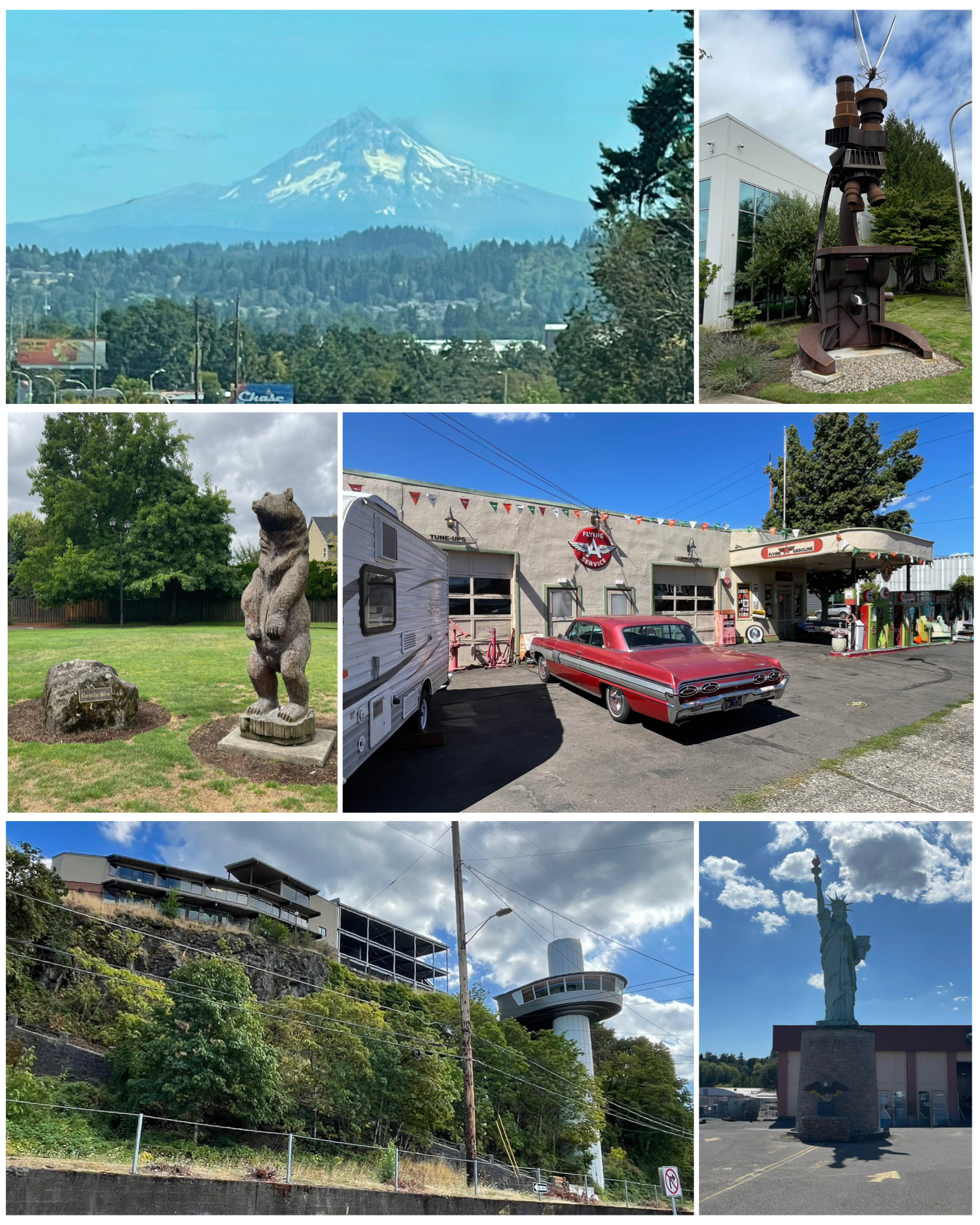 There were several Roadside attractions in this part of Oregon as well.  First up was this giant replica of the Statue of Liberty.  This was not one of the Boy Scouts varieties, but rather a much larger version at over 50 feet tall including her pedestal. She sits in the middle of a parking lot servicing a small strip mall, and was built and purchased in 2007 by the mall’s owner who is of Middle Eastern descent. He did so to show his love of America.  Next up was this beautifully restored vintage Flying A gas station (at left, center right).  There does not appear to be an operating business here now, but it was apparently once home to Cycle Express – an ATV accessories store. But it looks great complete with its original gas pumps and signage.  Nicely done!  Next I drove to Oregon City to visit the only vertical street in North America.  This is the Oregon City Municipal Elevator (at left, bottom left) – believed to be the only municipal elevator in the country and one of only four in the world.  It connects the lower city to the upper city being 90 feet up the side of a cliff. It was originally water-powered when it was built in 1915 but later upgraded to electric in 1954.  Rides are reportedly free, and the views from the top observation tower are said to be quite nice.  I didn’t, however, avail myself of that feature. Next up was a wood carving statue of a large bear.  But this is no ordinary bear, it’s Gentle Ben from the 1960’s TV series of the same name.  The original author was Wilsonville native Walt Morey who created the story of a bear and his human pal living life in Alaska.  When Walt passed away his family donated  some land for a small park here in his hometown, which is home to this 500-bound bear sculpture.  I sure do remember watching that show as a kid growing up!  Finally, the last item found in Wilsonville was this 23-foot giant microscope made of steel that sits in front of the Oregon Department of Agriculture’s entomology department. On the eyepiece is a nine-foot flying bug.  This is pretty cool, and is a recent addition to the landscape having just recently been unveiled in Nov of 2024.  Though not a Roadside item per say, it seemed everywhere I was driving throughout the area had this big beautiful white capped mountain in the distance.  This would be Mt Hood – having a summit elevation of 11,249 ft.  It’s located just 50 miles southeast from Portland, and definitely visible all throughout the area.  Really nice!