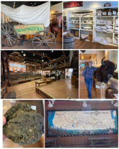 Also in Oregon City I visited what was reported to be the End of the Oregon Trail.  There they have a nicely done interpretation center and museum.  The Oregon trail is a 2,170-mile long route that provided wagons and migrating settlers a pathway from the Missouri River to the valleys of Oregon.  This trail passed through Kansas, Nebraska, Wyoming, and Idaho, eventually landing in Oregon.  The center was mostly focused on the “how” folks made their trek along the trail.  First loading up their cart with food and other supplies, then enduring the painstakingly slow and sometimes treacherous pathway to the west.  I sat through a 40 minute movie which did an excellent job of telling the story of what life on the trail was like for these early pioneers. They even had an actual wagon that had come over the trail back in the 1840s (at right, top left).  Besides getting a selfie with Hank the Bison, and holding onto an actual buffalo chip (aka poop) that was used as fire fuel back in the day, it would be an interesting walk through time and through three giant buildings disigned to look like wagons, to get through all the history. It was certainly an interesting and educational stop.