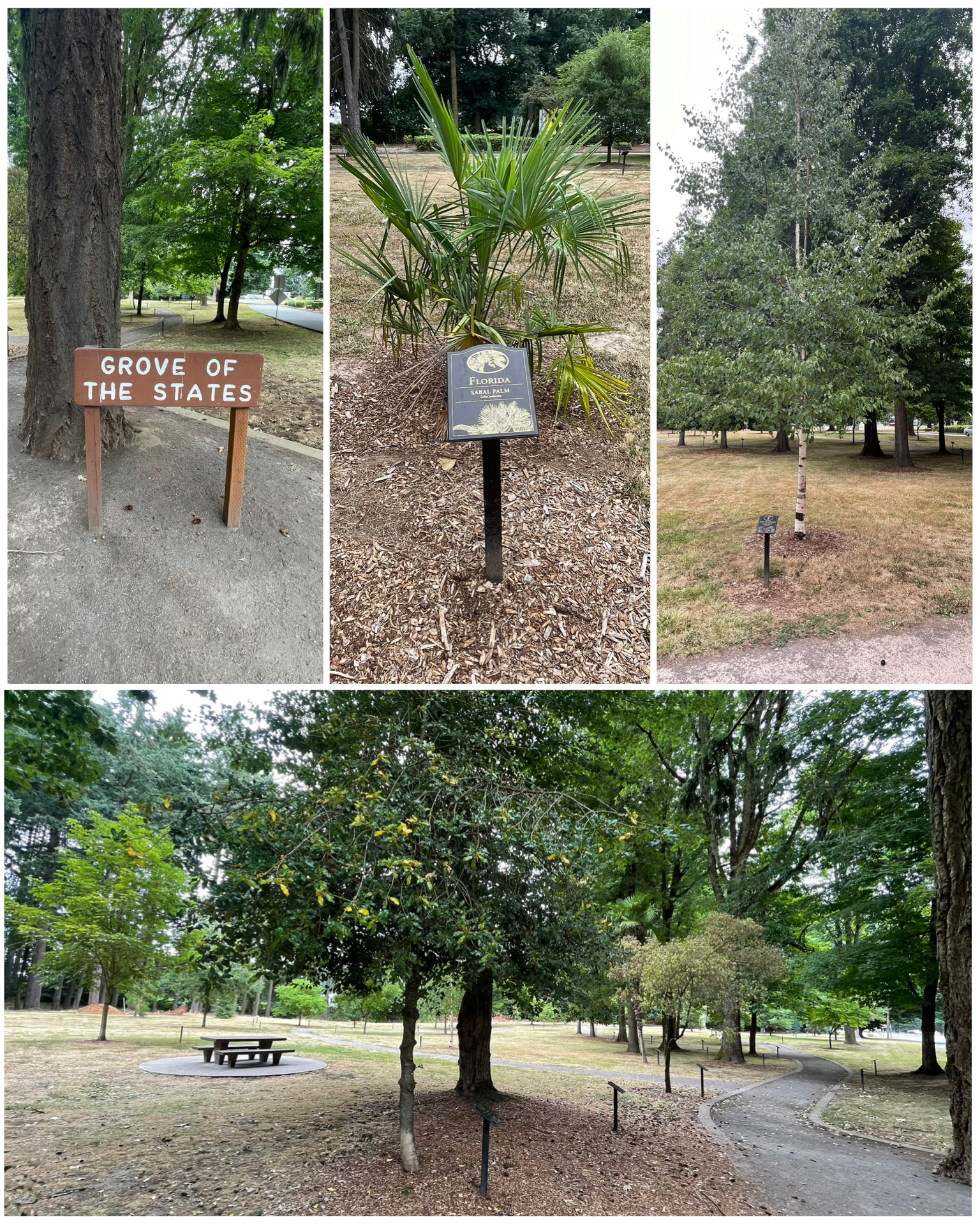 The next day, I began my exploration day by heading south on the I-5 interstate, making my first pause at the Baldock Rest Area just 5 miles south of the campground.  It’s much like many other interstate rest stops complete with bathrooms, picnic tables, vending machines, and lots of parking for cars, busses, RVs, and trucks.  But what made this particular rest stop unique was the other thing that it featured. Known as the Grove of the States, this is a nice walking trail that meanders through a lightly forested area, featuring a variety of trees that are representative of each of the 50 United States.  So for each of the states, there is a plaque in front of a tree that is unique and native to that state.  It was fun walking through seeing each of the trees.  I was especially looking forward to seeing the entries for Florida, and for my home state NH. Florida’s entry was a Sabal Palm (at left, top center).  It was noted online that some of the trees had died, and had to be replaced. This small bush like variety from Florida looked to be one of those recent refreshes.  I continued my walk along the trail, looking forward to seeing what might be the NH participant. I walked and I walked, passing many states along the way, but not yet had reached NH.  What could it be?  Could it be a pine or spruce?  Or perhaps a an elm or a red maple.  Then as I turned the corner, I saw it out of the corner of my eye.  It was still too far for me to see the sign, but I knew instantly that this was the NH tree.  It had a white bark – the only tree in the entire collection with a white bark. It had to be!  Sure enough, there it was – the NH Paper Birch (at left, top right).  I grew up with birch trees in my back yard, and have always had a special connection with them.  While most all other trees have a dark bark, the white color of the birch is kinda unique and special.  So, my trip here was fun, and also reminiscent of my youth back in NH.  It was a fun stop!