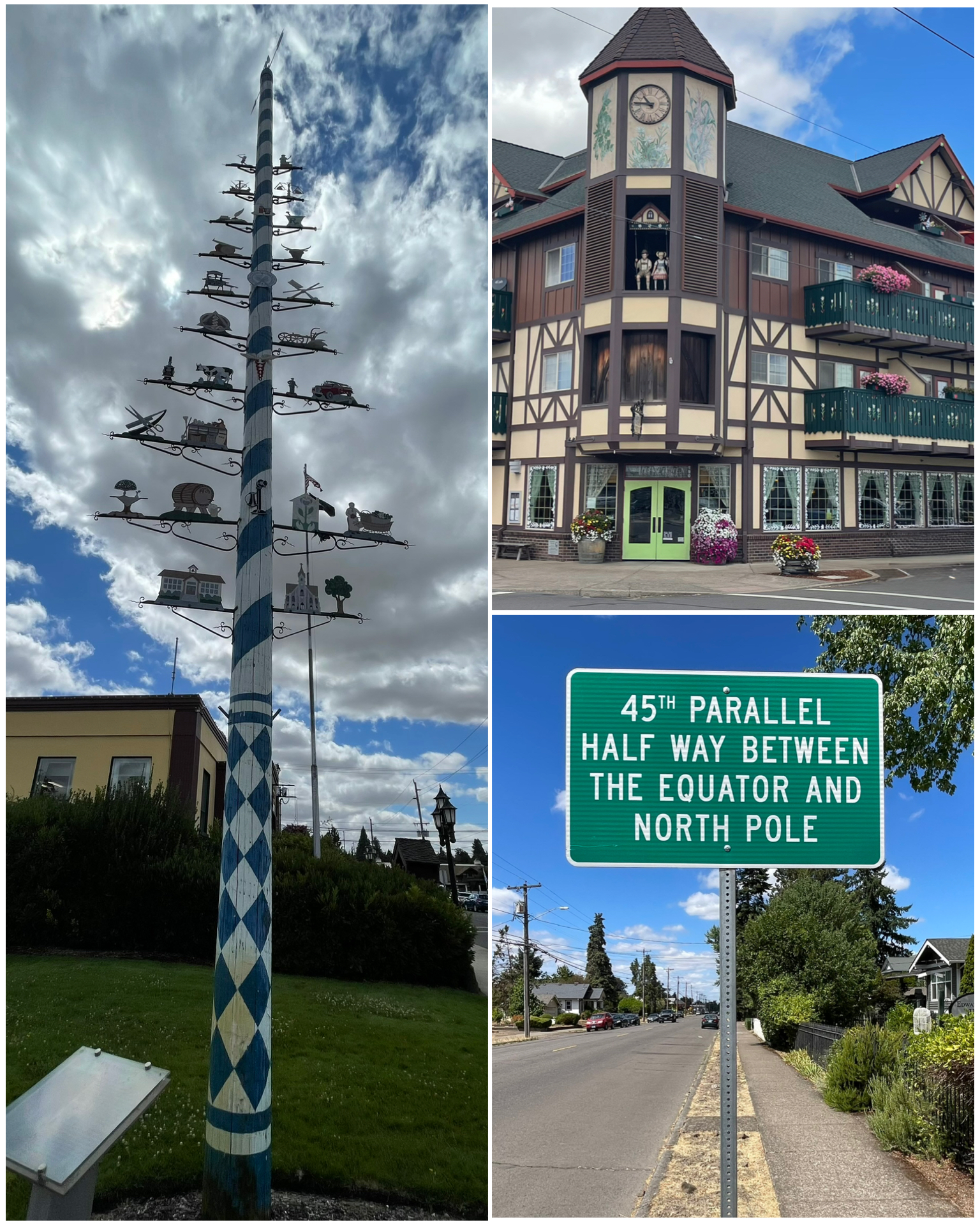 I continued my drive to the south to the town of Mt Angel.  There I would find another Bavarian-themed town, though clearly not quite as extensive as I had visited back in Leavenworth, WA. But, they did have the customary Der Maibaum (aka May Pole) towering up to the sky filled with pieces that tell the story of the town.  The lower branches contain items reflective of the town’s spiritual and intellectual foundation including representation of the parish and school, while the upper branches depict interests and skills of the town’s people, including golfer at the very top branch.  Apparently a symbol representing the love of the game by many of its residents.  Across the street is the town’s Glockenspiel – which is technically a percussion instrument consisting of pitched aluminum or steel bars.  Mt Angel has such an instrument located in a 49-foot tower at the corner of a Bavarian-style building.  It features wood carvings of community members and performs a musical routine four times daily at 11, 1, 4, and 7.  Sadly, I was hours away from its next performance so I didn’t stick around for that.  It was constructed in 2006 and was inspired by the Glockenspiel located in Munich, Germany.  The small town has a population of just over 3,000, but is well known for its annual Oktoberfest.  It’s the largest such event in the entire PNW, and has grown its attendance from 39,000 in its first year 1966, to upwards of 375,000 by the 1980s.  I’ll bet its quite the party!  Down the road a bit was this 45th Parallel sign – signifying the half way point between the Equator and the North Pole.  Always kinda fun to find these little interesting intersections.