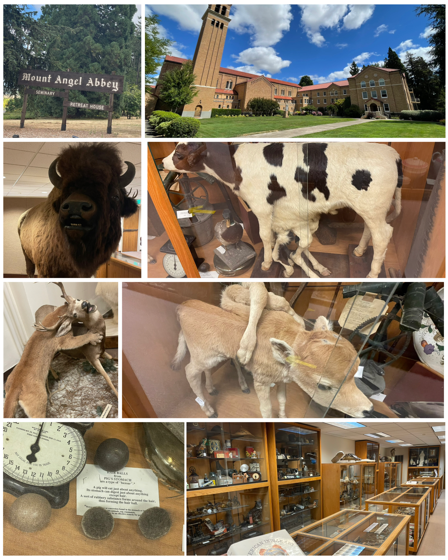 Just a short drive away from downtown and sitting atop Mount Angel is the Mount Angel Abby – a religious retreat house, seminary, and Catholic monastery. It was founded on October 30, 1882 by Benedictine monks who immigrated to the United States from Engelberg, Switzerland. The Seminary serves numerous western dioceses and has approximately 170 students and boasts a liberal arts college and the Graduate School of Theology.  While it was a very beautiful and peaceful campus, that was not the reason for my visit.  Rather, it was the onsite museum whose entrance sign describes it as a “rather eccentric collection of artifacts”.  Besides its religious artifacts, it would be its near 150 year span and whose farm would produce some rather interesting animal oddities that would get it into the Roadside list.  A conjoined baby animal (cow, deer, ??), an 8-legged cow, and a collection of some record-setting contents of a pig stomach (at left, bottom left) were the highlights.  They also had a nice collection of various wild animals – many of them stuffed and posed in interesting situations like this mountain lion getting the better of a screaming mule deer (at left, bottom half left).  It was an amazing mountain top campus, with a really weird museum and most certainly worthy of my stop.