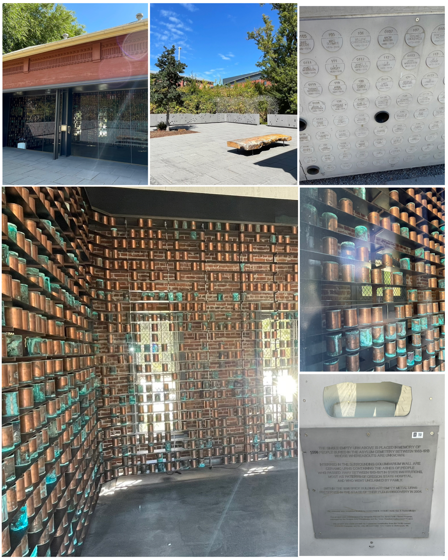 The final building I visited on the campus was the Hospital Memorial which has its own very interesting history.  Over the many early decades of the hospital’s operation, there would be the occasion of the passing of a patient while in their care (certainly including the mass poisoning story noted above).  Often times, families of the deceased either could not or would not claim the body, leaving the hospital with the responsibility to deal with it.  Fortunately, the hospital happened to have its own crematorium which was put to use thousands of times.  After cremation, the remains were placed in a sealed and uniquely numbered and stamped copper can, then stored in the basement of the building where it would be forgotten for many many decades.  In 2004, over 5,000 of these copper canisters, many of which were corroded and oxidized from moisture exposure, were brought to the publics attention after Oregon state senator Peter Courtney came across them while touring the hospital.  Subsequent governmental and public pressure forced the hospital to take some action to better honor the remnants of these deceased patients.  So, they identified each of them using old records matched to the unique canister number, then transferred their remains into new modern urns (at left, bottom right).  A new wall was built (at left, top center) to safely and securely store each of the urns in numbered slots, while a new glass wall building was built to house the thousands of original, and now historical, empty copper cans.  They also continue to take the initiative to reach out to any surviving family members who might want to now claim the remains – a few of which have done so which created the empty holes in the wall (at left, top right) now void of any remains.  A somewhat happy and satisfying ending to an otherwise tragic hospital practice that was publicly exposed.