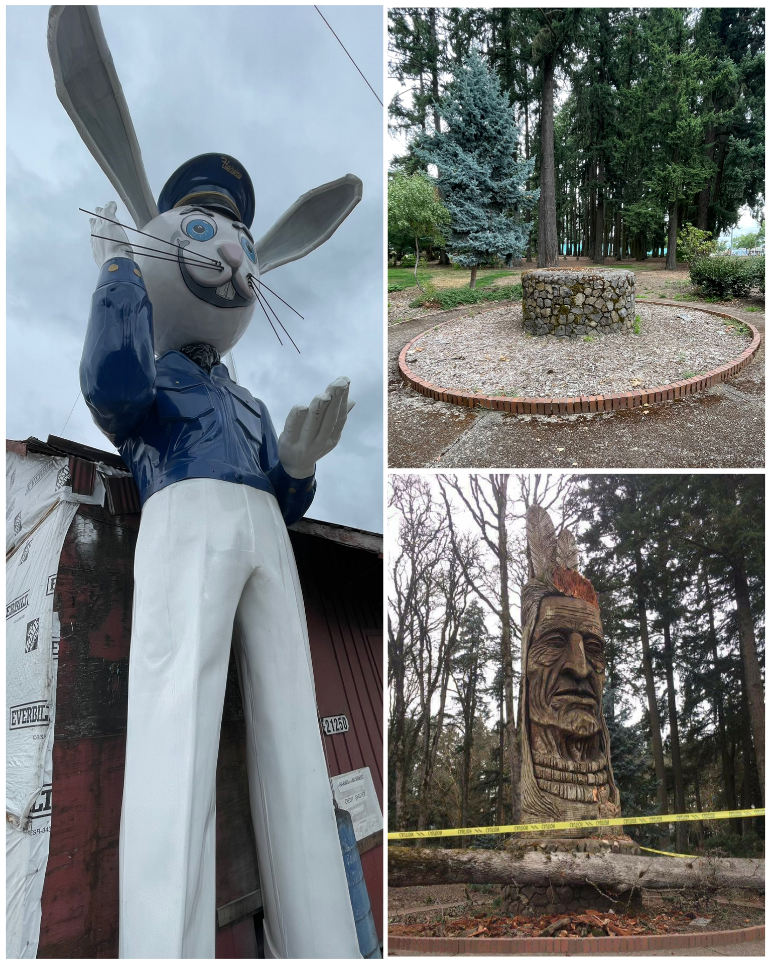 Later in the day I headed west of Portland to chase after a few interesting Roadside items.  First up in Aloha, OR is this giant rabbit.  Known as Harvey the Rabbit, this half man, half mutant rabbit stands upwards of 26 feet tall, and was the brainchild of Ed Harvey.  The story goes that this statue began life in the late 1950’s as a Texaco Big Friend statue (similar to the famous Muffler Man statues that are all around the country), that got damaged in a 1962 storm.  The Texaco station owner brought the damaged mascot to Ed Harvey – owner of Harvey Marine and a well skilled craftsman at fiberglass repair.  Ed fixed the Big Friend good as new, but the station owner never returned to retrieve him – leaving him there at the boatyard for several years.  Then Ed had an idea.  He was a fan of the Jimmy Steward film that featured an invisible rabbit named Harvey, and since rabbits bring good luck, he figured if he made the statue into a giant rabbit, he could use it for advertising for his marine store. And that it did!  The rabbit was famous and became a lovable icon in the town.  Despite the marine business closing in 2017, Harvey is still hanging around town and will likely never leave. Next I drove out a bit further to the west to Hillsboro to visit Shute Park.  There, I was supposed to find another one of Peter Toth’s wooden Indian carvings, but alas all I found was this empty stand (at right, top right).  Well, apparently on February 2017, the top of the carving was damaged when a wind storm blew a tree into the front side, shearing off part of the head also causing the entire statue to lean (see news photo at right, bottom right).  Sitting in this state for far too long, the inside of the exposed interior wood began to deteriorate.  Eventually in June of that year, it was determined that the statue could not be saved and was removed.  So, had I read about this tragic demise of this statue as part of my homework, I could have saved a trip out to the park.  But anyway, it was a nice park and a nice walk through it to at least see where this chief once stood.