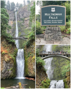 There are lots of beautiful waterfalls in Oregon, with perhaps the most popular being Multnomah Falls  – a National Scenic Area that is part of the Columbia River Gorge. Located east of Portland, right adjacent to, and visible from I-84, this nominal 620 feet tall falls is the tallest in the state, and reported to be the 2nd tallest year-round waterfall in the country (though that second claim is apparently often in dispute).  Either way, it is a beautiful waterfall.  The iconic Multnomah Creek Bridge, built in 1914, spans the creek roughly at the point where the upper 542 foot falls ends, and the lower 69 foot falls begins,  and is itself part of the National Register of Historic Places. The falls attracts over two million visitors each year, making it the most-visited natural recreation site in the U.S. Pacific Northwest. Access to the falls is via a dedicated exit from the interstate from either direction that leads to a parking area.  A short walk including a trip through a tunnel that goes under the interstate, leads to the visitor area.  To keep things flowing smoothly, the NPS issues timed entry tickets so that crowds can remain balanced, with some entries available onsite to accommodate those that are just passing by.  What an absolutely beautiful waterfall – most surely one of the biggest and best I’ve ever seen.
