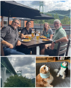 The next day was Saturday, and the day that my brother Gerry was to be driving down from Washington to Portland to spend the weekend with his daughter, and my niece, Nicole.  In mid afternoon, I met up with them at Nicole’s really nice condo, after which I was given a walking tour of parts of downtown Portland on our way to a nice German restaurant. Nicole is doing great as an agent helping elder folks with all the nuances associated in getting setup for assisted living, while at the same time truly enjoying living in her element as a resident in downtown Portland.  Of course I also had the pleasure of meeting the kids – Ezra and Beau, a pair of beautiful Cavalier King Charles Spaniels.  It was dinner time, and apparently their long floppy ears will sometimes end up getting soiled in their food, so to solve this they get them pinned back with headbands first.  How absolutely adorable!  I also had the pleasure of meeting Chris, Nicole’s friend, who besides being a really nice guy, happens to be a very skilled cinematographer.  In fact, he has led filming activities for many documentaries – one recent one in particular titled “Atomic Echos”.  It’s a documentary that tells the story of “two friends, connected by family histories on opposite sides of World War II, set out to explore the lasting trauma of the Hiroshima and Nagasaki bombings. While Japanese hibakusha endure lifelong health complications and psychological scars, American atomic veterans who witnessed the bombings’ aftermath also struggle with radiation-related illnesses and PTSD.”  It was just recently released last month (Aug) as part of the 80th anniversary of the atomic bombings, and is free to stream on PBS.  I really enjoy documentaries, and since I spent several years living in Japan, this one was even more interesting to watch.  It’s an amazing story – of course with great cinematography.  Highly Recommend you check it out!  Part of our walk to the restaurant took us past the iconic Portland bridge known as the St. Johns Bridge (at right, bottom left).  This bridge also happened to be our viewpoint from the restaurant as seen in the background of this blog dinner photo.  Great seeing you again Nicole and Gerry, and nice to have met you Chris.  Looking forward to seeing more of your work in the future.
