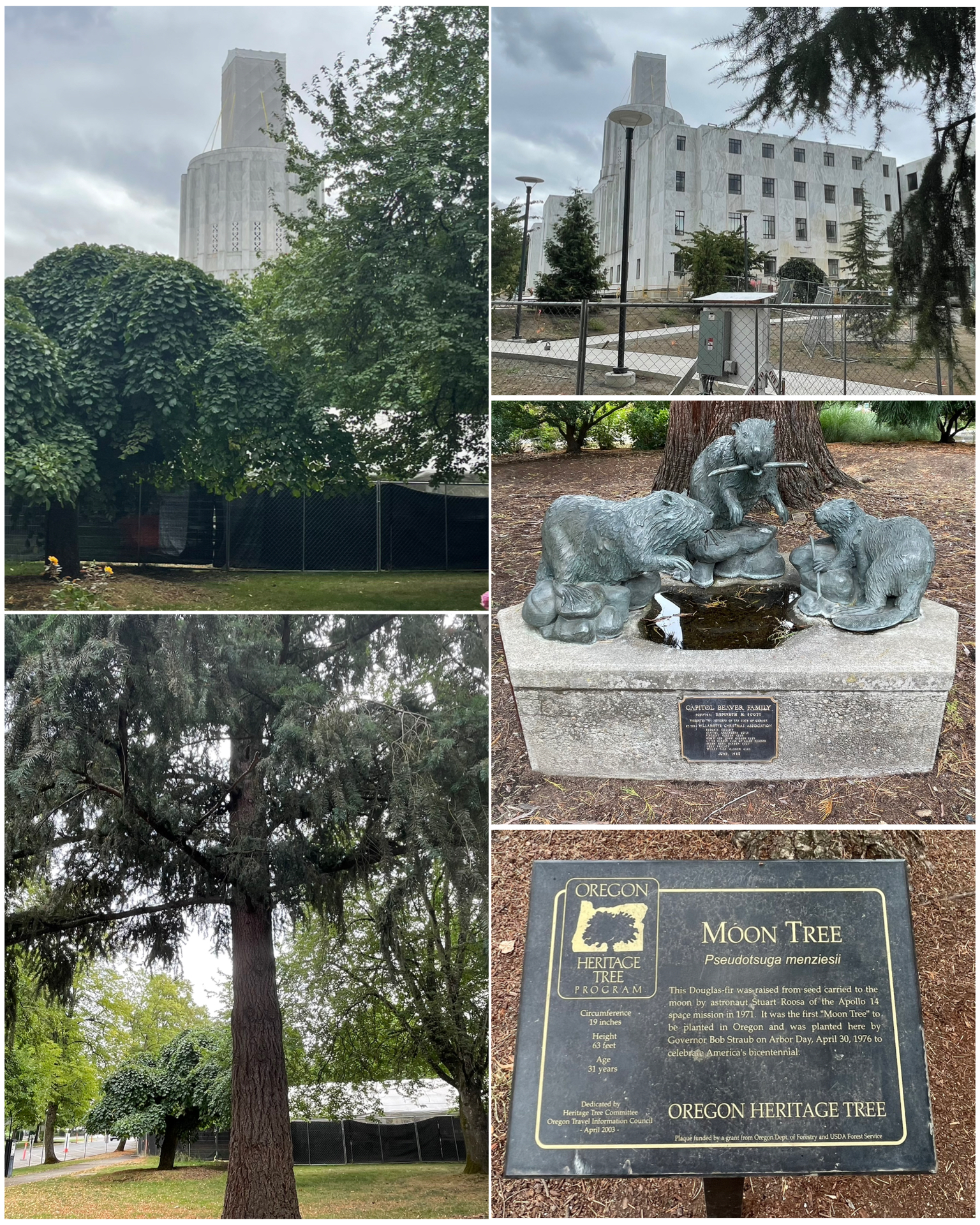 On my last day in the area, I went back to the south, first again stopping in the capital city Salem.  I was hoping to check out the state capital building, as well as a few Roadside items along the way.  Sadly, the capital building is currently undergoing some significant renovations, and is closed to the public and not scheduled to reopen until the end of Sep.  But, one of the Roadside items I wanted to see was the beautiful golden lumberjack – officially known as the Oregon Pioneer, that sits atop the capital building.  I figured even if the building is closed, I’d be able to catch a glimpse of the woodsman.  But alas, the renovation was so extensive that even the old pioneer was encapsulated and covered up (at left, top right).  Construction fencing all around also prevented getting anywhere near the building for some up close candid photos, so I did my best to get what I could.  Near the capital is a small park that had a couple of interesting things in it.  First up was a Moon Tree.  I have visited a few other Moon Trees in my travels, and this one was nicely grown up.  This Douglas fir started out as a seed that took a trip to the moon along with astronaut Stuart Roosa who was part of the 1971 Apollo 14 mission.   Also in the park was this interesting group of beavers gather around chomping on some tree branches.  It’s called the Capital Beaver Family and was a donation to the Capital of the State of Oregon by the Willamette Christmas Association.  Cute little statue!