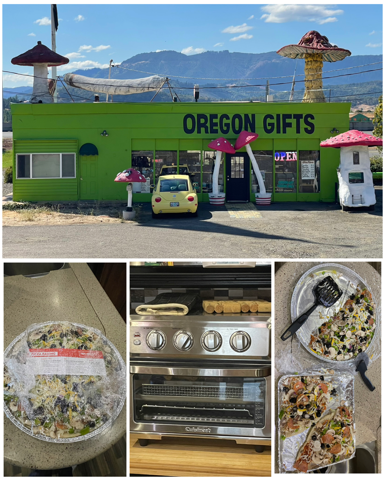 So I left the Portland area and headed south on I-5 to the community of Sutherlin/Umpqua.   I pulled into the KOA, checked in the with office, then headed to my nice full hook up pull thru site.  It wasn’t long before I had the RV unhooked from the truck, all the power line and hoses connected, slides out, AC on, and a beer opened.  As I was relaxing and doing my planning for what to see in the area, I got an urge for a pizza.  Lucky for me, a quick google map search showed a pizza place right here in town, just a couple miles out.  They had a website where I could order the pizza online, which I did.  ETA for pickup was 25 minutes.  So, I did a bit more planning to kill some time, then went off to go get my delicious pizza.  When I arrived, there were a few pizzas sitting on a wire rack, one of which had a sticker with my name on it.  Wait – this can’t be right!  This pizza is wrapped in plastic, and more importantly, it’s uncooked.  I approached the counter to inquire about my pizza being raw, and was told that’s how they prepare them.  They are take-home and cook yourself pizzas.  I mentioned I live in an RV and asked if they could cook it for me, and was told that they don’t even have an oven.  There was nothing obvious that I saw on the website that indicated these are uncooked pizzas.  I new I was screwed as this pizza had no chance of fitting in my little electric oven.  Granted, I do have a bigger RV oven that runs on propane, but I’ve only used it a couple of times, and lighting the pilot is an absolute pain in the a$$. Not to mention, I have no idea how much propane I have as that too is something that I haven’t used in several years.   So my only option was to cut up the pizza into pieces, and cook it in multiple sessions.  I did that and overcooked the first batch, but did a bit better on the second.  Why would a pizza place only offer raw pizzas?  That just didn’t make sense to me.  Then, as I walked out of the pizza joint, I noticed this other business in the same strip mall that had a giant joint and some magic mushrooms on its roof.   It all now became clear to me.  The locals like to cook their munchies!