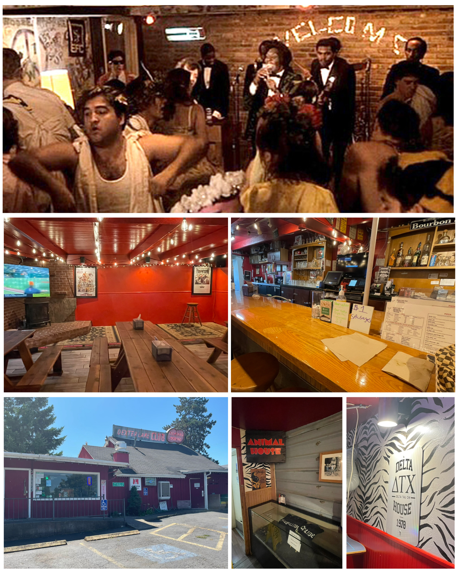 One of the Roadside entries that I had found was a visit to the Dexter Lake Club in Dexter, OR (at right, bottom left).  It was a bit of a hike to get there being some 65 miles northeast of where I was, taking just about an hour to get there.  But, after reading its claim to fame, I had to go.  It turns out this was one of the filming locations for the crazy comedy movie Animal House.  In the movie, this bar was the road trip scene where the guys from Delta took the girls from Emily Dickinson College on dates, and where the music group Otis Day and the Knights were performing (at right, top).  There were lots of original artifacts in the bar that were present in the 1978 movie including the zebra wallpaper and the short stage on which Otis and his band performed.  This movie has always been one of my favorites, and was one that I’d seen hundreds of times as this was one that I had ran when I was a projectionist in North Little Rock, AR.  It was just about lunch time when I arrived, so I decided to order a beer and lunch and to stick around a bit to truly take in all the Animal House juju that was present.  I chatted with the bar owner a bit who was knowledgeable about the movie and its history.  In fact, it was he who told me that all the college campus scenes were filmed in nearby Eugene at the University of Oregon.  So I got on the Internet and did some searching for Animal House filming locations, and sure enough found references to several of the UO buildings that were used in the film.  So obviously, that would become my next stop.