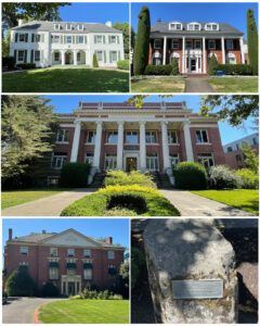 Universal Studios was the production company for the Animal House movie and was looking for a college campus from which to film.  After being turned down by the University of Missouri, they reached out to the University of Oregon who agreed with a compensation package including $20k and an agreement that the university not be identified in the film.  Many of the current university buildings were used in the movie to represent the fictitious Faber College.  The main campus building in which Dean Wormer had his office used UOs Johnson Hall (at left, center), while the Phi Kappa Psi House (at left, top left) – a UO fraternity house on campus,  became the straitlaced Omega House in the film.  Sadly, the home to the drunken ‘Delta’ fraternity was demolished in 1986, while its famed location is memorialized by this plaque on a rock (at left, bottom right). The universities Sigma Nu fraternity (at left, top right) became the Tri Pi Sorority House, though the rear, where Bluto (John Belushi) climbs the ladder to peek in on the coeds, was not from this location.  Lastly, where the Delta boys call upon the girls from Emily Dickinson Hall was actually filmed at UOs Gerlinger Hall (at left, bottom left).  It was fun walking around this campus seeing all these famous Animal House movie buildings.