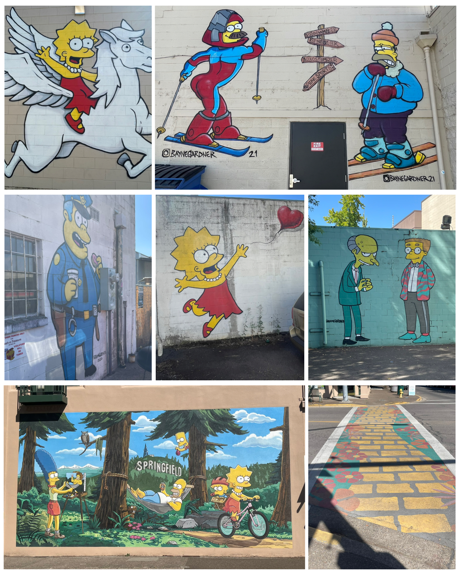 After my visit to Eugene, I headed a few miles to the east to explore the town of Springfield.  For any Simpsons fan (not really me), you might recognize this name as the fictional town from the series.  Apparently, there is a huge battle going on between Springfield, OR and Springfield, IL as to which town is home to this long running animated show.  A bit of research found that both towns have received numerous subtle references from the show, and both claim to be the host city.  But supposedly the show’s creator, Matt Groening, signed a plaque in the city’s Hall confirming it was modeled after Springfield, Oregon.  Groening, a Portland, OR native, chose Springfield, OR as the namesake because he was inspired by the show Father Knows Best, which was set in a Springfield, Oregon. Further, many character names like Flanders and Lovejoy, are based on street names in Portland, where Groening grew up. The town has certainly embraced the fact that they are the host town, and have lots of murals all around town to prove it. It was fun walking around seeing individual characters featured in all sorts of hi jinx, with a large full cast featured mural with the town’s name (at left, bottom left).  A must stop for any “real” Simpsons fan.