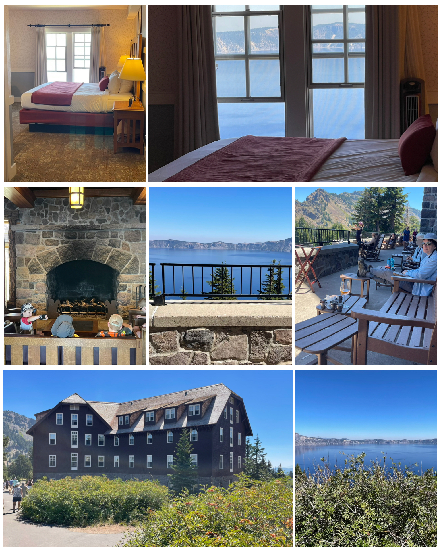 Also on the property was the Crater Lake Lodge. The hotel, built in 1915,  is owned and operated by the National Park Service, and provides breathtaking views to the lake some 1000 feet below.  There was a nice front sitting area (at left, center right) with rocking chairs to sit and admire the amazing view (at left center).  They also had a terrific restaurant where I enjoyed a nice early afternoon lunch.  After lunch, I walked around the hotel a bit to see a ginormous fireplace that I would imagine in the cold winter months would be blazing with warmth.  There was a stairway that led to who knows where, so I walked up to see what was there.  Turns out, it just leads to the hotel rooms.  But as luck would have it, one of the rooms was open and being serviced by the cleaning crew, and offered a glimpse of the inside (at left, top left), along with with the amazing view from the room itself (at left, top right).  Room rates seem to range from $245 to $345 per night – which given the location and views, seems pretty reasonable.  Overall, it was an amazing day exploring this absolutely beautiful lake and National Park.  If it’s not already there, this is a must see on your bucket list.