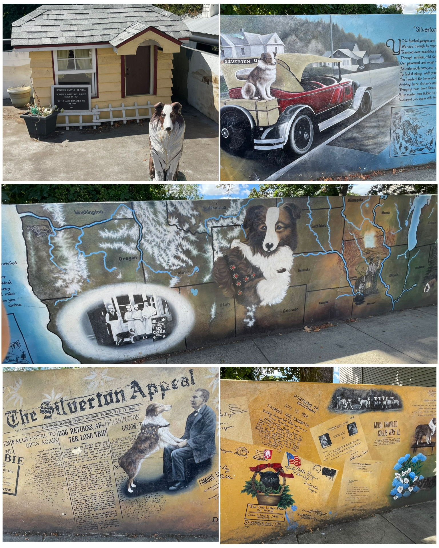 This next feature is for my sister-in-law Debbie who enjoys a good dog story.  Silverton, OR is home to the adventures of Bobbie the Wonder Dog.  Bobbie, a Scotch Collie-English Shepherd mix belonging to Frank and Elizabeth Brazier, would go on a family road trip from Silverton, OR to Wolcott, IN.  It was 1923, so travelling would likely be no more than 15mph or so.  Frequent stops at gas stations, hotels, or tourist camps would have been commonplace.  Soon after arriving in Wolcott, a pack of three other local dogs chased Bobbie away from its owners and never returned.  Following several days of searching and even putting a notice in the local newspaper, Bobbie was never found.  The Braziers returned to Silverton assuming they would never again see their beloved pet.  Six months later, in Feb of 1924, a ragged and obviously weary travelled Bobbie arrived in Silverton.  He would walk the more than 2,500 miles back, crossing rivers and mountain ranges, all during the coldest parts of winter.  Letters from those who saw and engaged with Bobbie confirmed he used those various stops they had made on the way out as points of reference on his solo return trip.  He was an instant hero!  Showered with fame, news stories, gifts, and lots of adoring fans, he was also featured in Ripley’s Believe it or Not, as well as a staring role in a silent Hollywood film (HERE – featuring the actual dog Bobbie, though it’s not his actual story, but rather a similar and interesting story none the less).  He was the honored guest for a Portland Home Show where he received a custom made luxury dog house, as well as a crowd of 40,000 people who stood in line to meet and pet him.  Now that’s a homecoming!  A 70 foot mural telling his life story was painted in 2004 commemorating the 80th anniversary of his returning home, is on the main street of Silverton, as well as a statue and replica dog house.  There’s an annual kids pet parade led by the winner of a Bobbie look-alike contest, along with a drawn wagon carrying the bobbie statue.  He lived a good life until his death in 1927.  He is buried at the Oregon Humane Society in Portland, and it was said that famed TV dog star Rin Tin Tin laid a wreath at his grave.  What an amazing story of a dog determined to get back to his home.  Truly amazing!  A nicely done short documentary about Bobbie is also available on YouTube HERE.